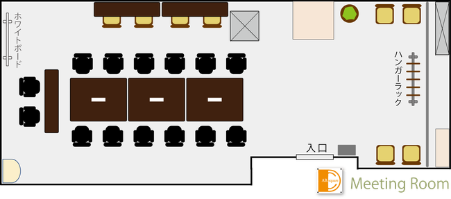 ABスクエアのミーティングルームは約40平米。ゆったりとお過ごしいただけます。チェアはひじ掛け付きで程よいクッション。長時間でのご利用も楽々です。
